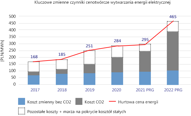 W latach 2020-2021 roku notowania cen uprawnień do emisji CO2 zanotowały bezprecedensowy wzrost o 50 euro (+300 proc.), co przełożyło się na ponad dwukrotny wzrost kosztów wytwarzania energii, a w konsekwencji na ceny energii elektrycznej. Uprawnienia do emisji CO 2 stają się coraz istotniejszym składnikiem ceny energii elektrycznej w całej Europie. Elektrownie emitujące dwutlenek węgla są zobowiązane do umorzenia w każdym roku uprawnień odpowiadających sumie ich rocznych emisji. Do 2018 roku udział kosztów CO 2 w produkcji energii elektrycznej wynosił niespełna 20 proc. W 2022 roku będzie on już jednak stanowił ponad 60 proc. kosztów produkcji i stanie się głównym czynnikiem cenotwórczym w konwencjonalnych jednostkach wytwórczych.